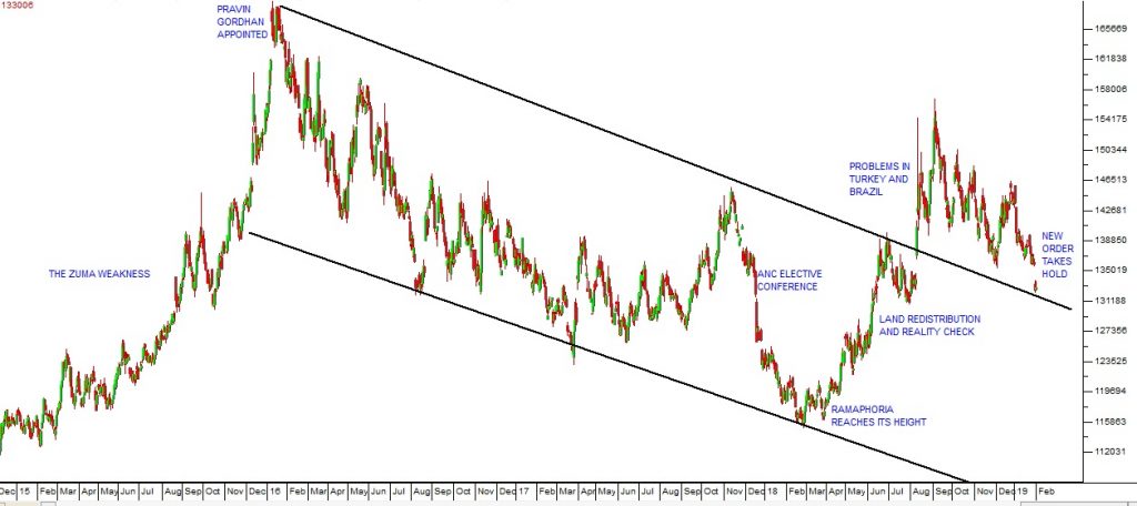 This weakness came to an end with the appointment of Pravin Gordhan as Minister of Finance in January 2016. His leadership saw a definite improvement in overseas perceptions of our economy and the rand entered a long-term strengthening channel. Even after he was fired this strength persisted and gained momentum with the ANC elective conference and the surge of optimism which has become known as “Ramaphoria”.