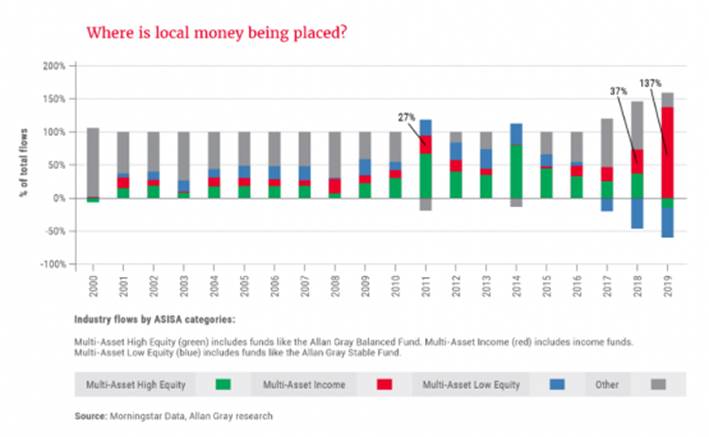 Over the last two years South African investors have moved a huge amount of money into income funds. As the graph below from Allan Gray shows, 2018 and 2019 saw the biggest inflows into this category in 20 years.