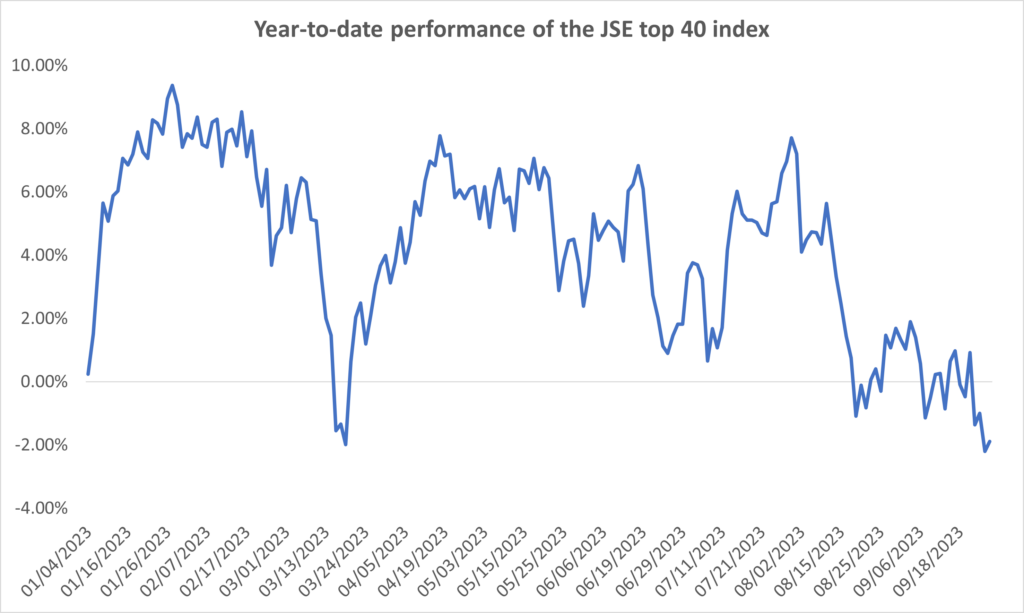 The JSE Top 40 is on a downturn again and has fallen to its lowest year-to-date point recently. On Tuesday afternoon, the index closed at a year-to-date performance of -2.2%.
