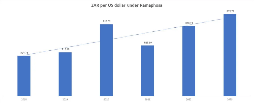 During Ramaphosa’s presidency, the rand weakened from R14.80 in 2018 to R19.72 in 2023, significantly diluting South African wealth on an international level.
