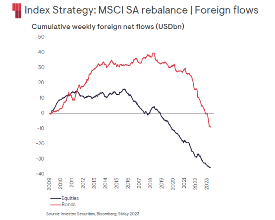 “As a result, foreign investors have sold local equities for 48 of the last 54 months and now are positioned at half the benchmark weight in South Africa within the emerging market index. Local investors are fast approaching the 45% maximum allowed in offshore holdings.