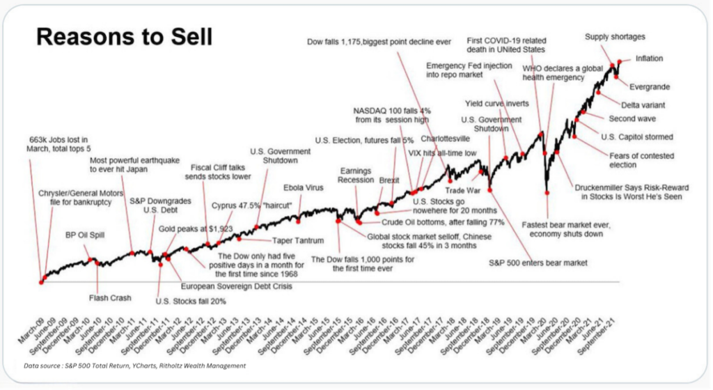 The above graph of the S&P 500 illustrates multiple reasons for investors to have sold over more than a decade and at the same time the benefit of having remained invested and ignoring the short-term volatility.