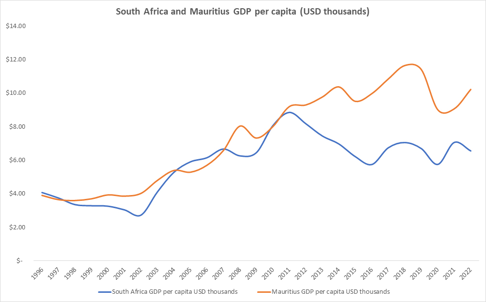 It raises the question of why Mauritius excelled while South Africa has been moving in the opposite direction over the last decade.