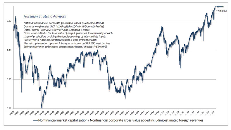 Hussman’s preferred valuation model the ratio of the total market cap of non-financial stock to the revenue of those stocks is near all-time highs, beating peaks reached in 2021, 2000, and 1929.